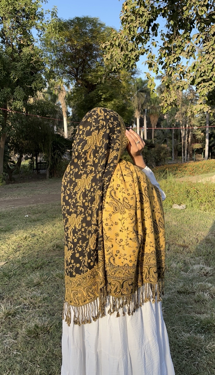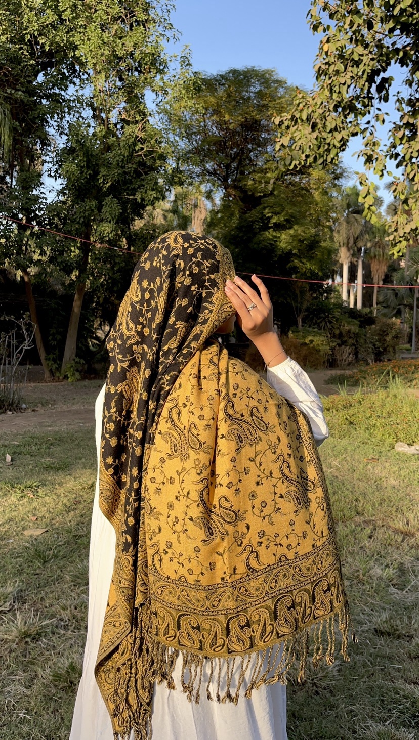 Cotton pashmina, 2m x 80cm, double-sided — black on one side and gold on the other.