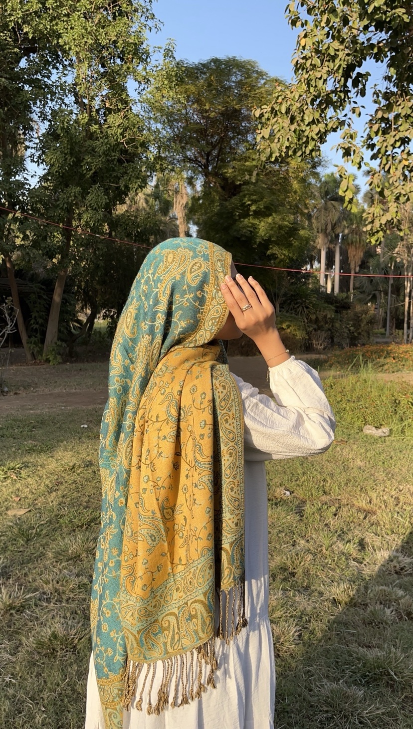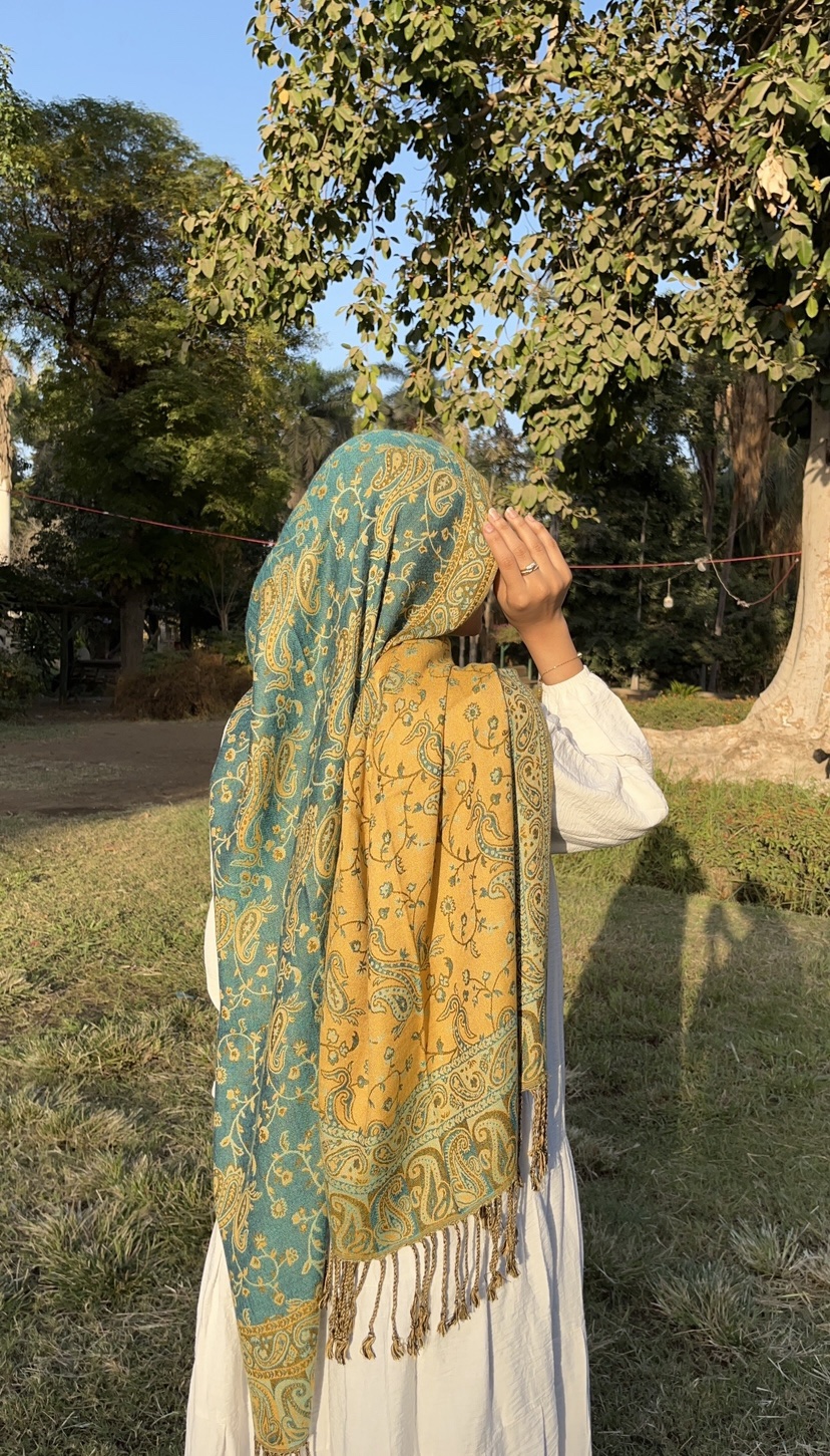Cotton pashmina, 2m x 80cm, double-sided — dark green on one side and yellow on the other